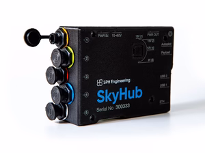 El SkyHub es un ordenador de a bordo para registrar datos geoetiquetados procedentes de diversos sensores como GPR, altímetro, magnetómetro, ecosonda o detector de metano. Por defecto, SkyHub viene con soportes y cables para el dron DJI M300/M350 RTK. Los soportes y cables para otros tipos de drones están incluidos en el pack.