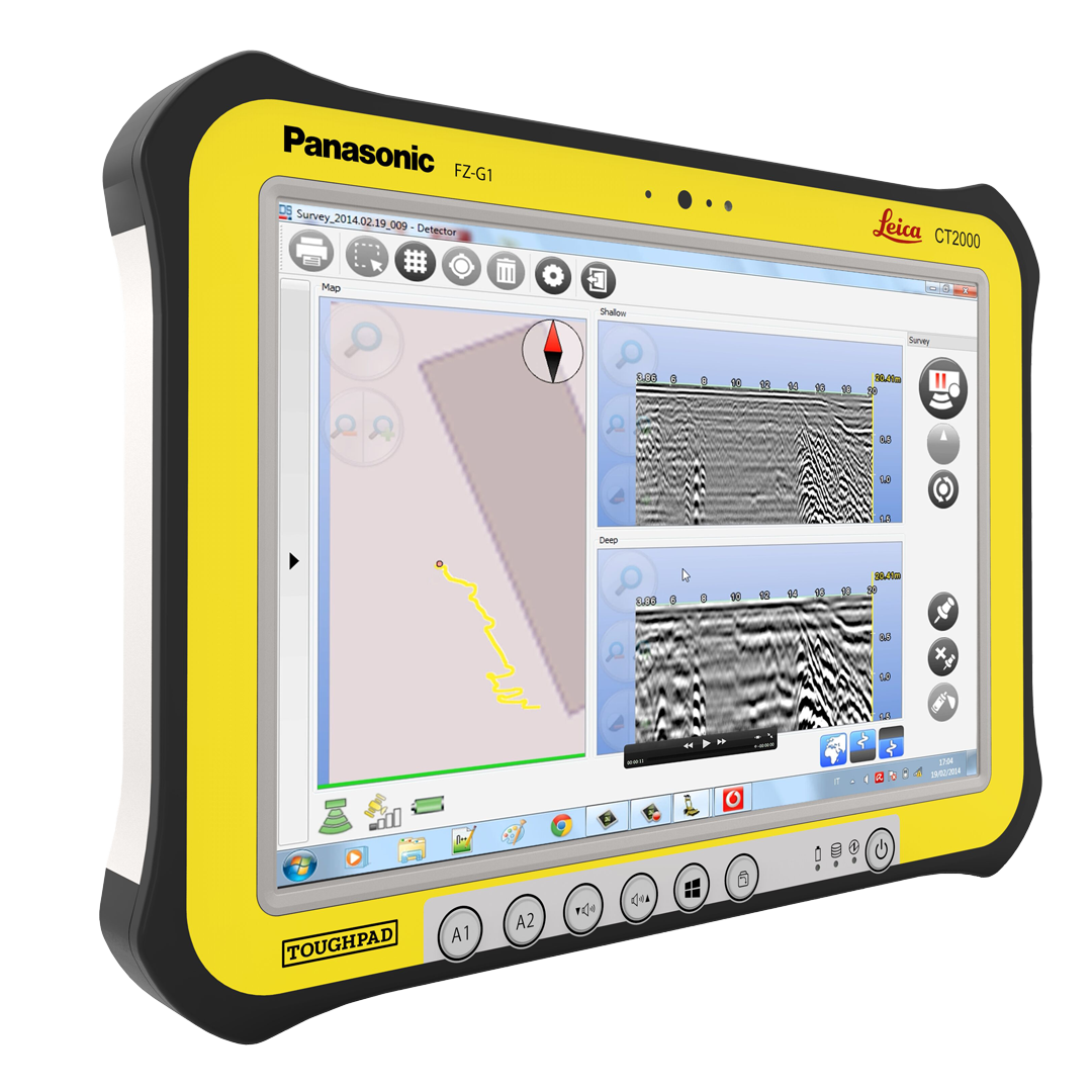 Una interfaz de usuario grande, intuitiva y robusta que muestra los datos de radar en tiempo real. Permite la visualización clara de los perfiles del subsuelo, la configuración de parámetros y la georreferenciación.
